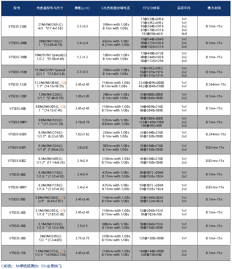 VTSE3S系列相机系采用采用Sony索尼Exmor,Exmor R,Exmor RS 背照式CMOS传感器,EXmor 系列CMOS传感器采用双层降噪技术,具有超高的灵敏度以及超低噪声。
