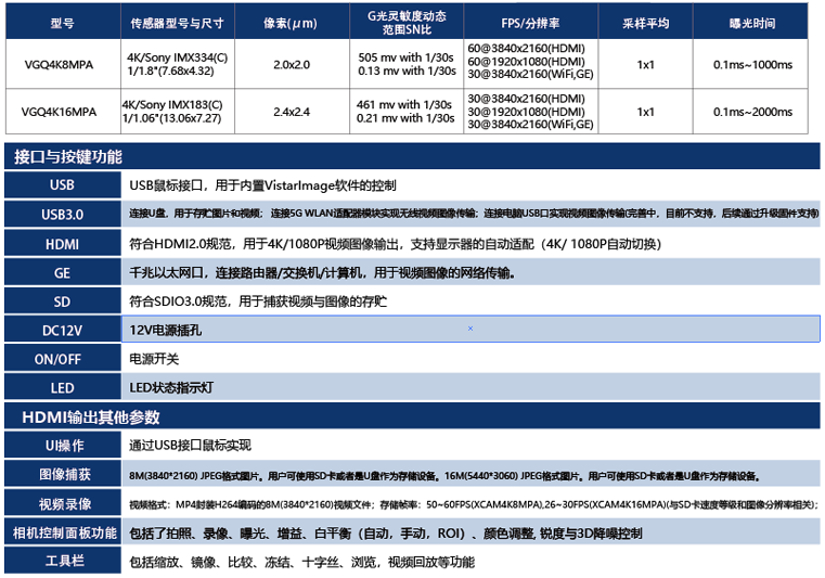 4K HDMI/GE/WLAN多接口输出,4K/1080P 自适应切换,4K帧速为3840*2160/60fpsSD卡/USB接口闪盘保存捕获图像或视频。