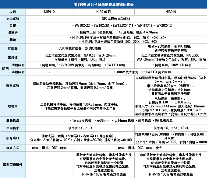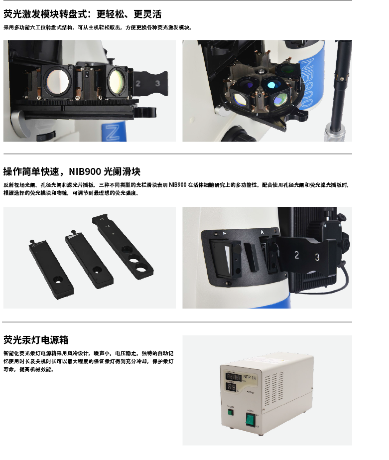 倒置研究级生物显微镜NIB900操作简单、功能强大、搭配灵活、性价比高。此系列有两种机型可供选择,满足您的不同需求:明场相衬机型NIB900和反射荧光机型NIB900-FL。明场相衬机型采用高亮度卤素灯照明(可选用LED照明),确保整个视场内亮度均一,成像质量尤秀。反射荧光机型采用高压汞灯照明(可选配长工作时间的金属卤化物照明),波段宽,亮度大,确保每个激发波段都能得到高亮度的显微成像。
