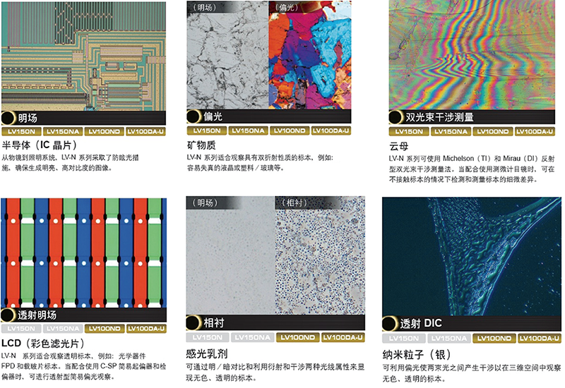 可支持多种观察方法:明场、暗场、偏光、微分干涉、落射荧光和双光束干涉测量等。