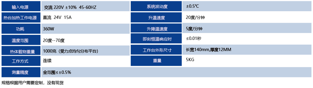 加热台由精密温度控制仪和载物恒温工作台二部分组成,二者由一大功率铜针镀镍金属插口导线连接, 载物恒温工作台置于光学或电子显微镜载物台上。特别适用配合偏光显微镜构成偏光熔点测量系统。