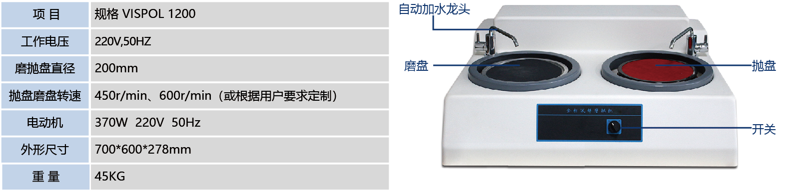 该机是将试样预磨和抛光操作结合为一体的经济机型,转盘通过带轮的转速比获得不同的转速,从而实现磨抛功能,是中小企业试样制作的理想设备。