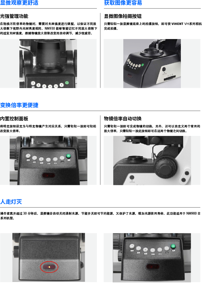 NM930在NM910科研级手动正置显微镜的基础上增加多种电动部件,简化了重复性操作,提高工作效率,使显微镜检更轻松。本款NM930科研级电动正置金相显微镜在确保好的光学性能和精巧的人体工学设计的基础上,加入多种便捷化、人性化设计,使显微观察更舒适,放大倍率转换更方便,图像拍摄更快捷。