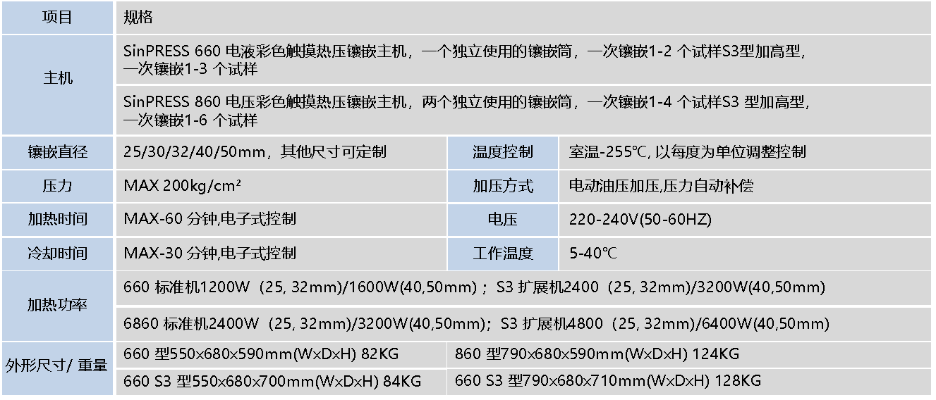 针对不同客户,多种系统尺寸可选择镶嵌直径标配32mm,有25mm 30mm 40mm 50mm ,可选SinPRESS 660为单模型SinPRESS 860为双模型标配一个模型镶嵌一个试样选购铜间隔片一次可达到2 个试样,大大提高制样效率。