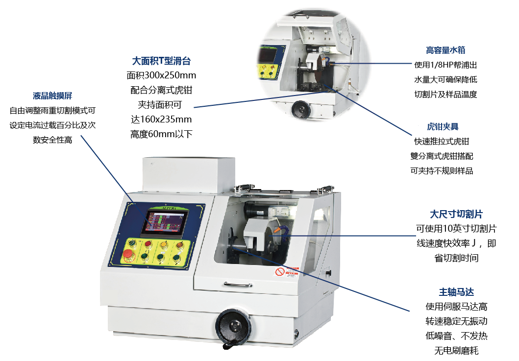 本机为慢速精密金刚石切割机及快速砂轮切割机两机一体的新型态桌上型切割机, 具备可调高度主轴, 伺服电机驱动, 是一款非常适合用在塑料射出, 电子应用领域的具有高性价比的精密切割机。